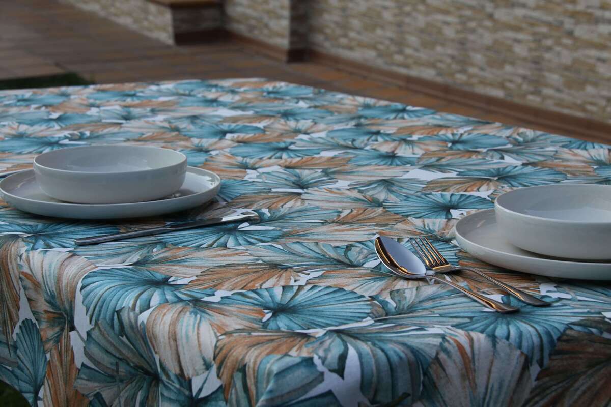 Mantel anti-manchas diseño Palmeral Azul, ideal para un comedor, una terraza, una sala de estar o cualquier lugar de tu hogar para brindar estilo y funcionalidad. Los manteles anti-manchas resinados fusionan la modernidad y la suavidad, con la protección y la elegancia de la mesa de su hogar.