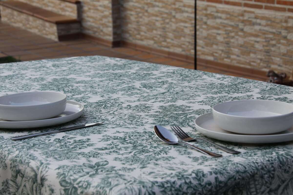 Mantel anti-manchas diseño Toile de Jouy, ideal para un comedor, una terraza, una sala de estar o cualquier lugar de tu hogar para brindar estilo y funcionalidad. Los manteles anti-manchas resinados fusionan la modernidad y la suavidad, con la protección y la elegancia de la mesa de su hogar.